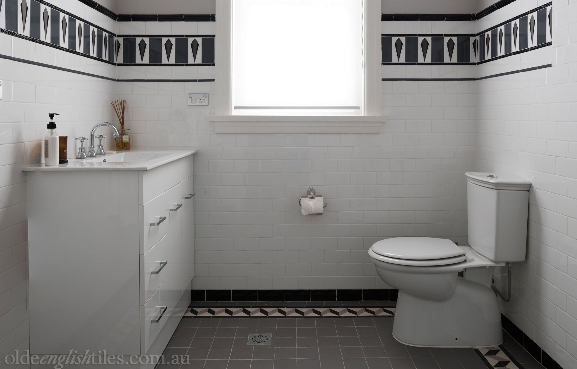 Bold and sophisticated, the Bristol border perfectly frames the Deco panel on the floor in this art deco bathroom. The Waldorf art deco tile pairs beautifully with white subway tiles on the walls and accentuate the overall look and feel.