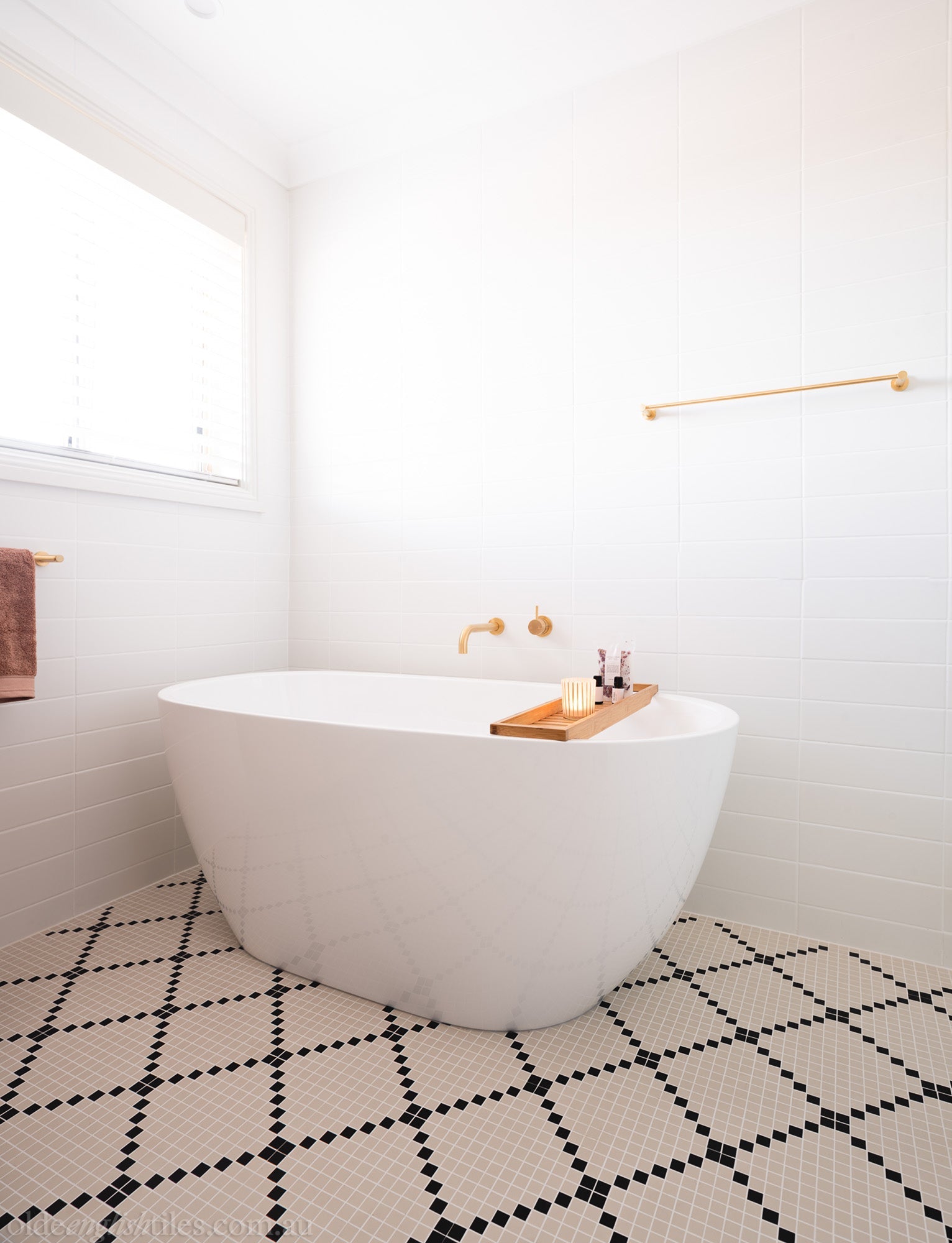 When our clients decided that they needed to improve their dated and impractical bathrooms, including main, en-suite & guest WC, the brief was for something essentially modern, functional, low maintenance, but with a classic timelessness. Consequently they chose mosaics for the floors - the Ritz pattern in black and super white, combined with 100 x 100mm matt white wall tiles stack bonded for a more contemporary feel. Timber vanities and brushed gold tapware add warmth, while circular mirrors & basins contrast with the strong diagonal grid of the floor. The result is a fresh, modern, organic feel adding to a functional streamlined look with just the faintest hint of Deco. These bathrooms certainly add style, comfort and value to this family's Hills District home.