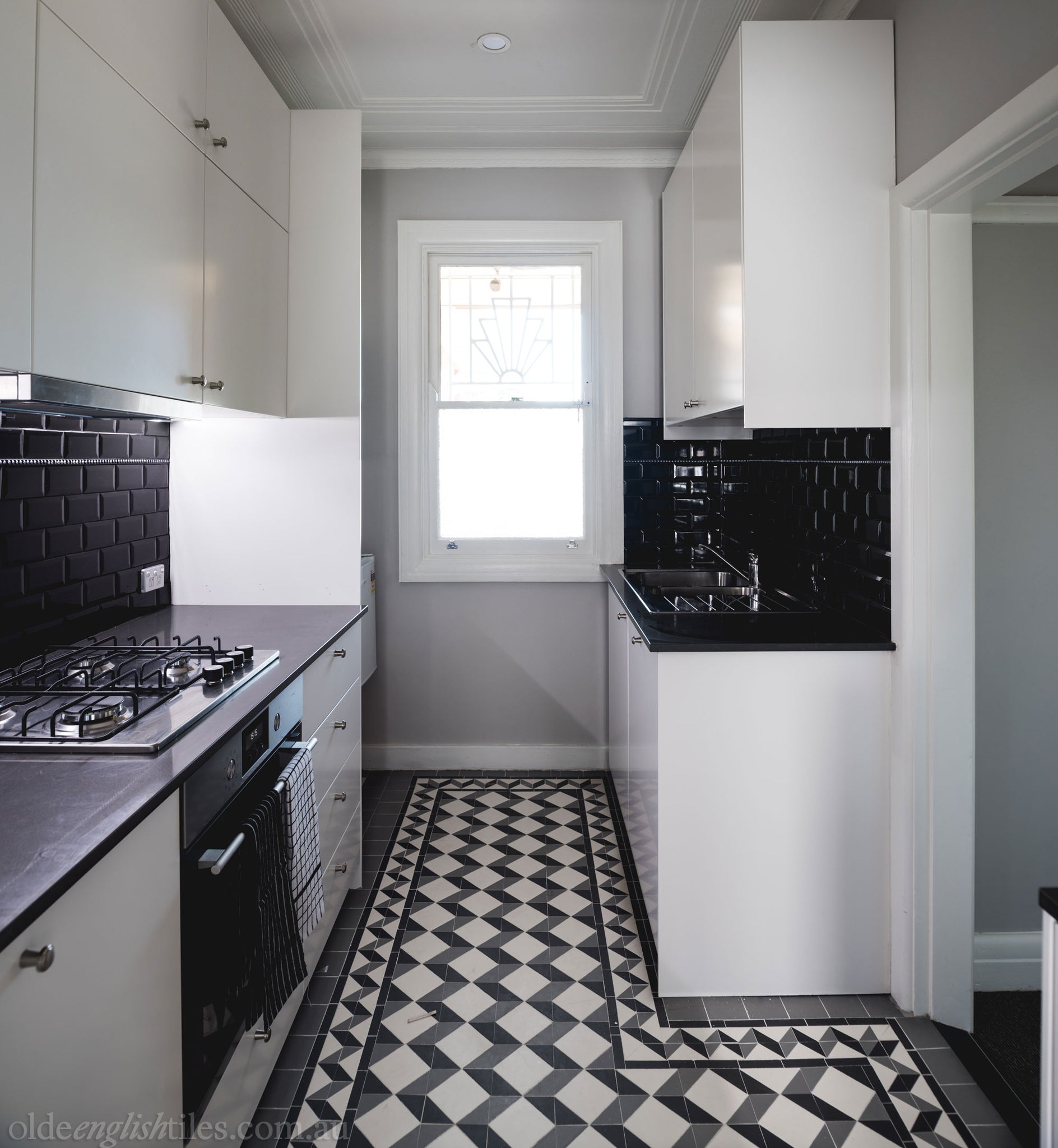 The Killara tile and Bristol border make for an eye-catching kitchen floor in this sophisticated Art Deco apartment. The bevelled edge wall tiles offer a sleek finish to a kitchen splashback.