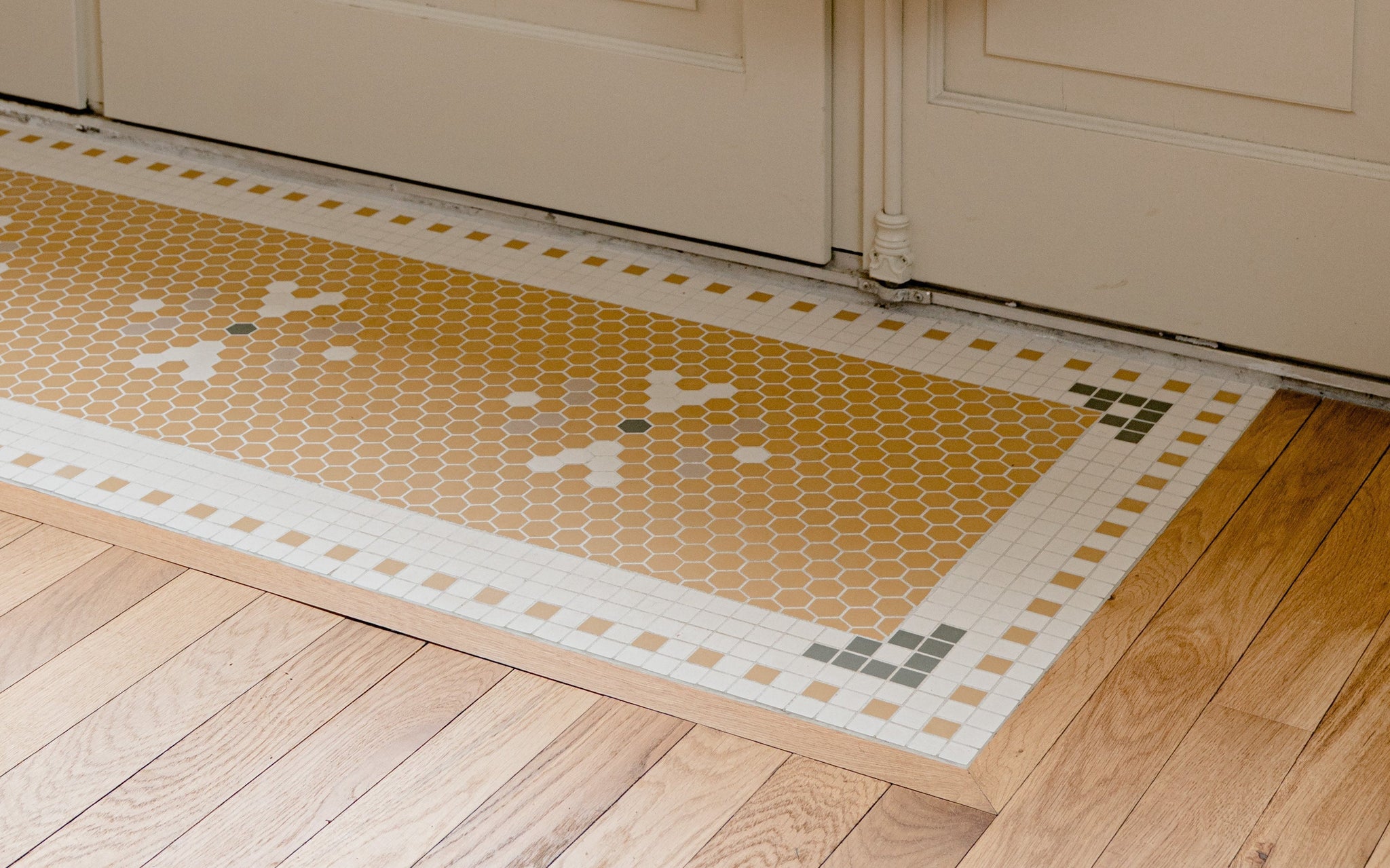 Soft, warm tones run throughout this chic French apartment where custom mosaic patterns bring a sense of character and quiet joy to everyday spaces.