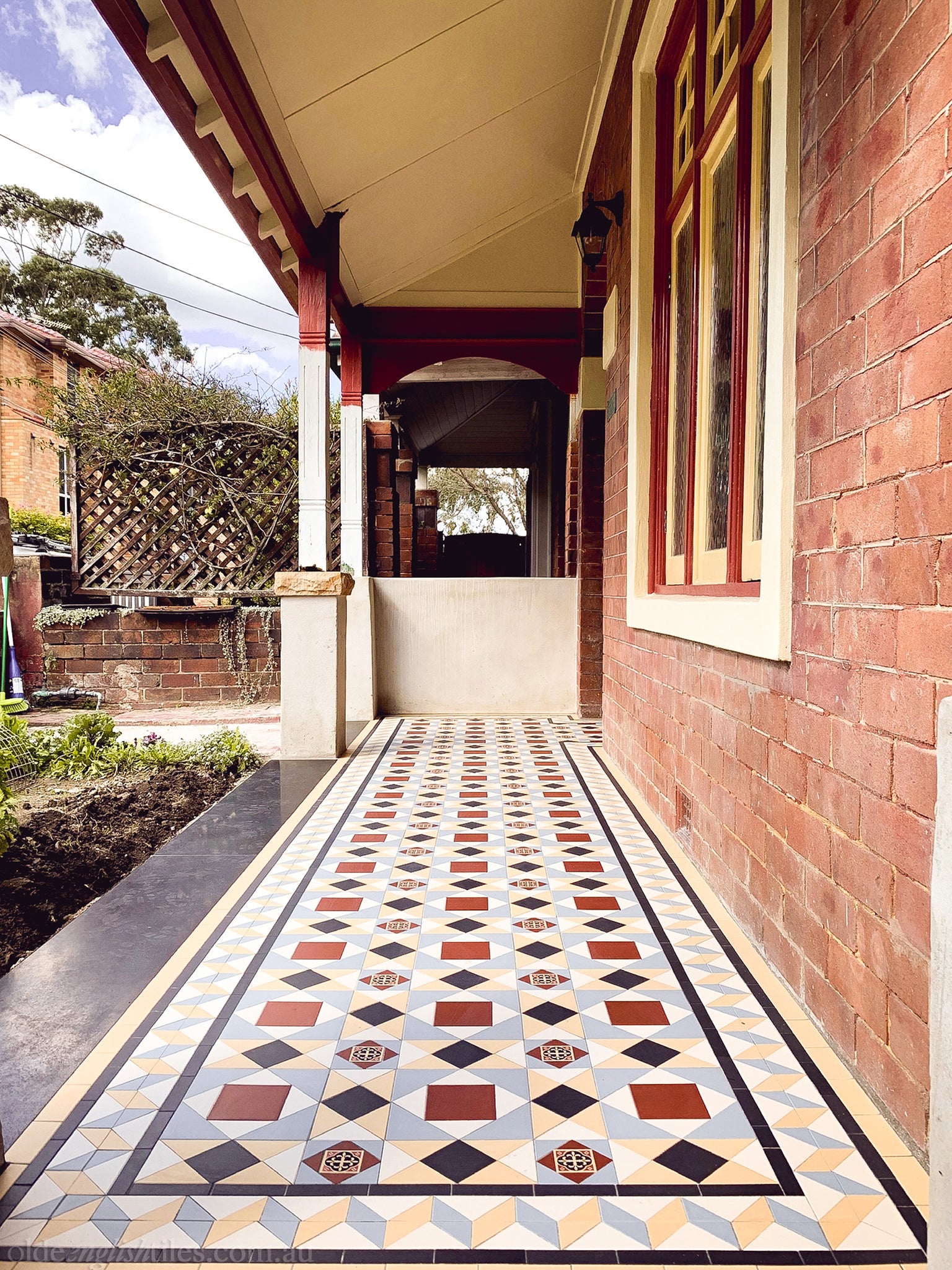 This couple from Sydney's lower north shore decided to upgrade the exterior of their Federation cottage in time for spring. They are passionate about authentic products with timeless appeal, so choosing tessellated tiles for their verandah was a logical one. The couple were keen to have something that made a unique statement and was eye-catching from the street. They went for the Glebe pattern combined with a Bristol border using a palette of fresh, bright colours that complement the heritage paint scheme.