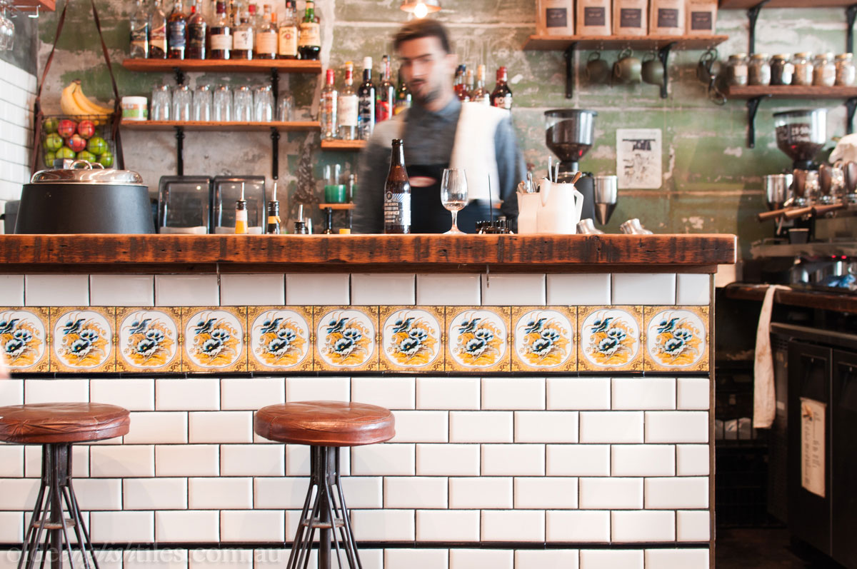 Our classic poppies fireplace tile are paired with a simple black and white wall tile to add character to this busy, beachside cafe and neighbourhod gem.