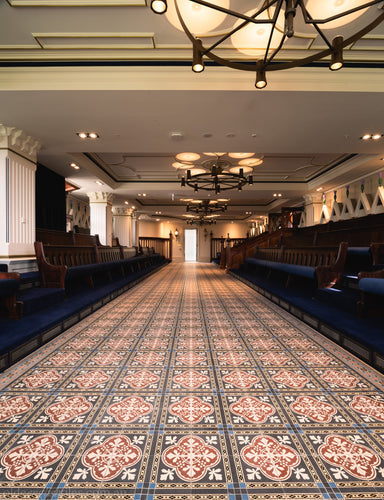 The 60m2 custom-designed floor of the 100 seat theatrette features our French encaustic tiles in combination with locally manufactured encaustics and tessellated elements.