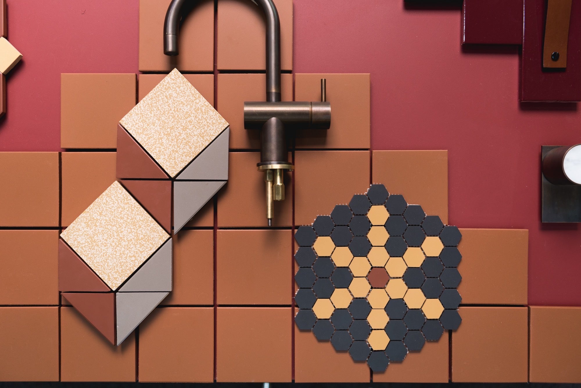 Drawing from a colour palette of browns, reds, terracotta and tan, the earthy coloured tiles in the below flat lay are a relaxing and grounding contrast to the shiny, metallic finishes that fill so many spaces today.